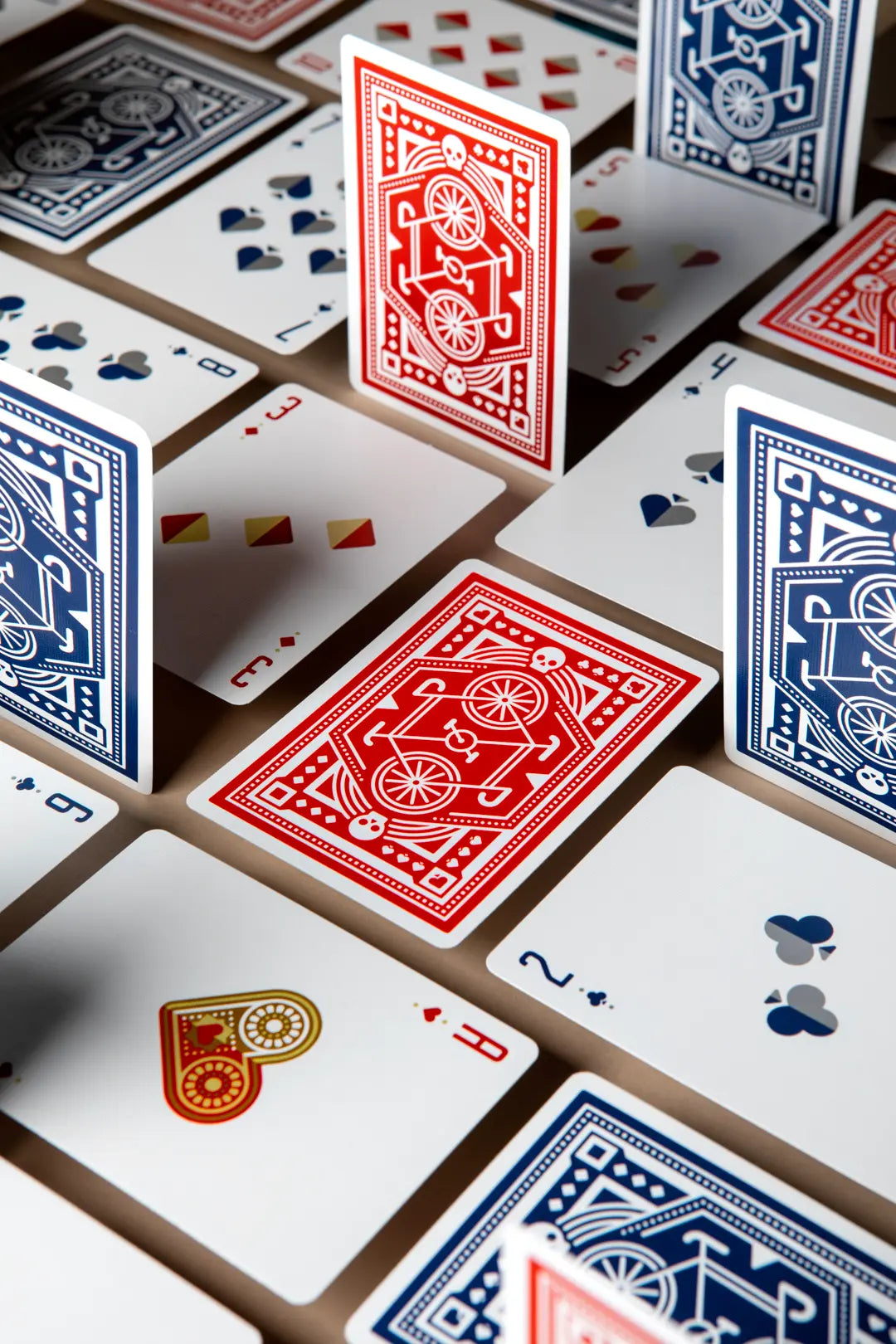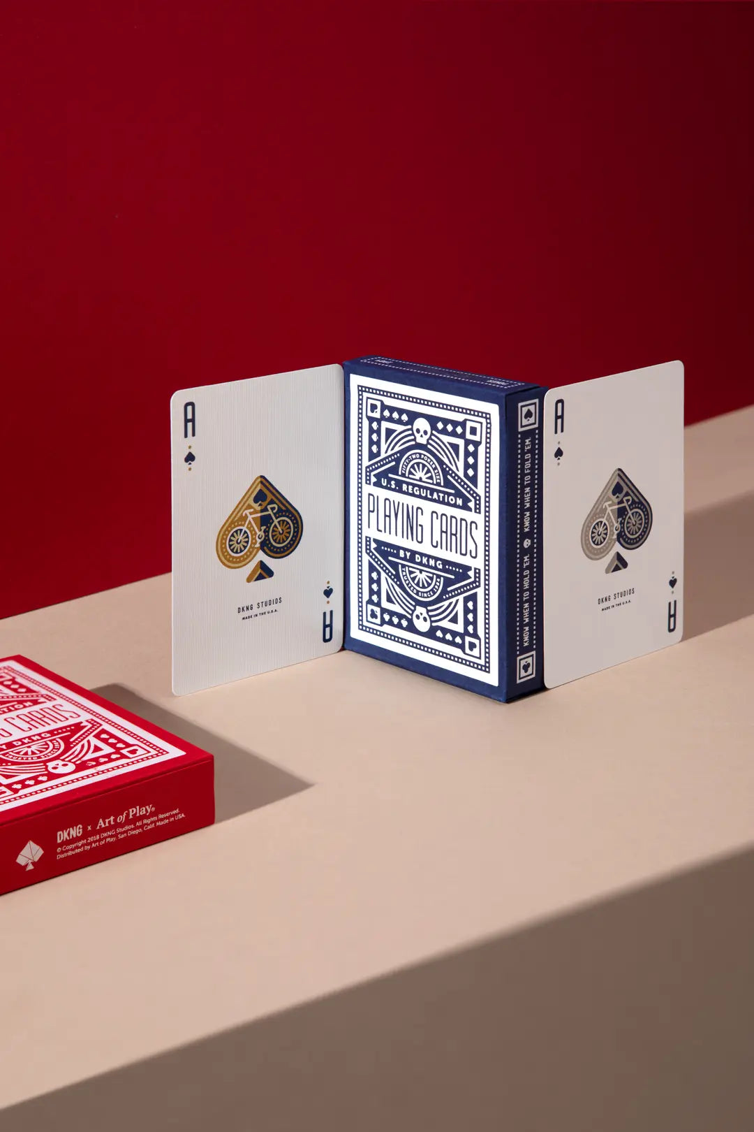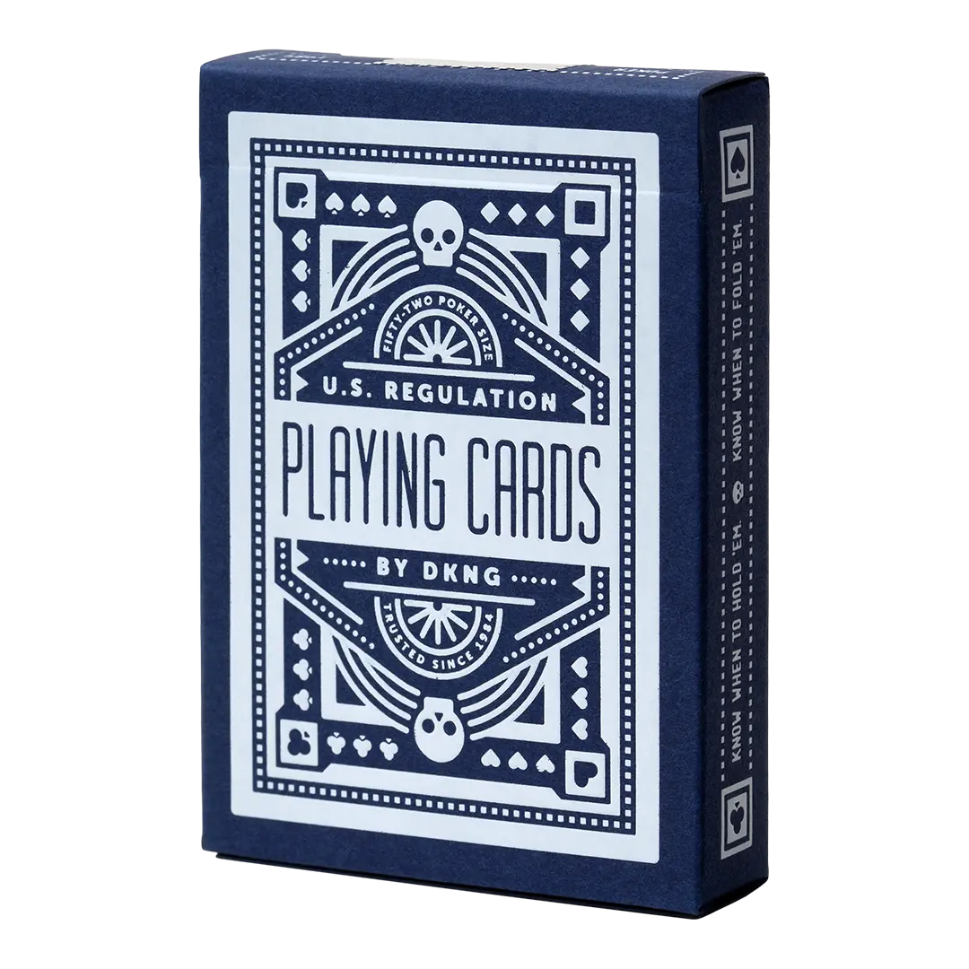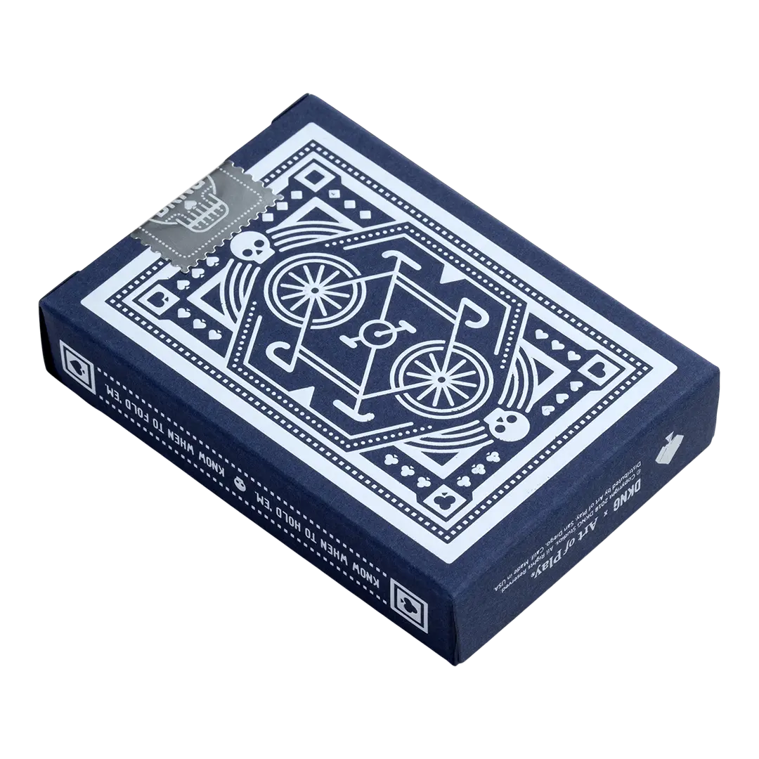 Created in partnership with DKNG Studios, "Blue Wheels" is part of the DKNG series of playing cards inspired by the classic Bicycle®️ Rider Back deck. The updated design is both familiar and modern and offers a fun alternative for any game requiring a standard deck of playing cards.